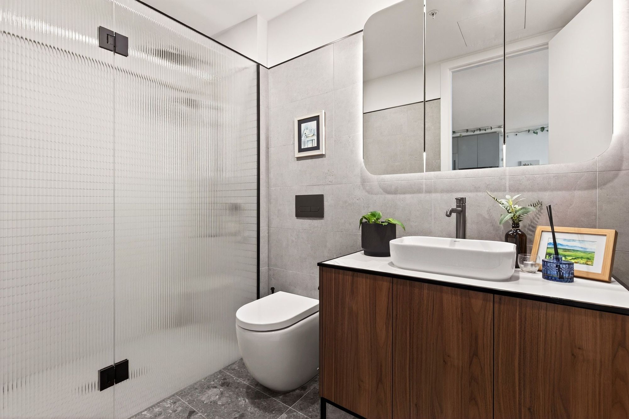Further, bathrooms complemented with textured wood laminate vanities, sleek feature lighting, fluted shower screens, back to wall toilets & architectural tapware.