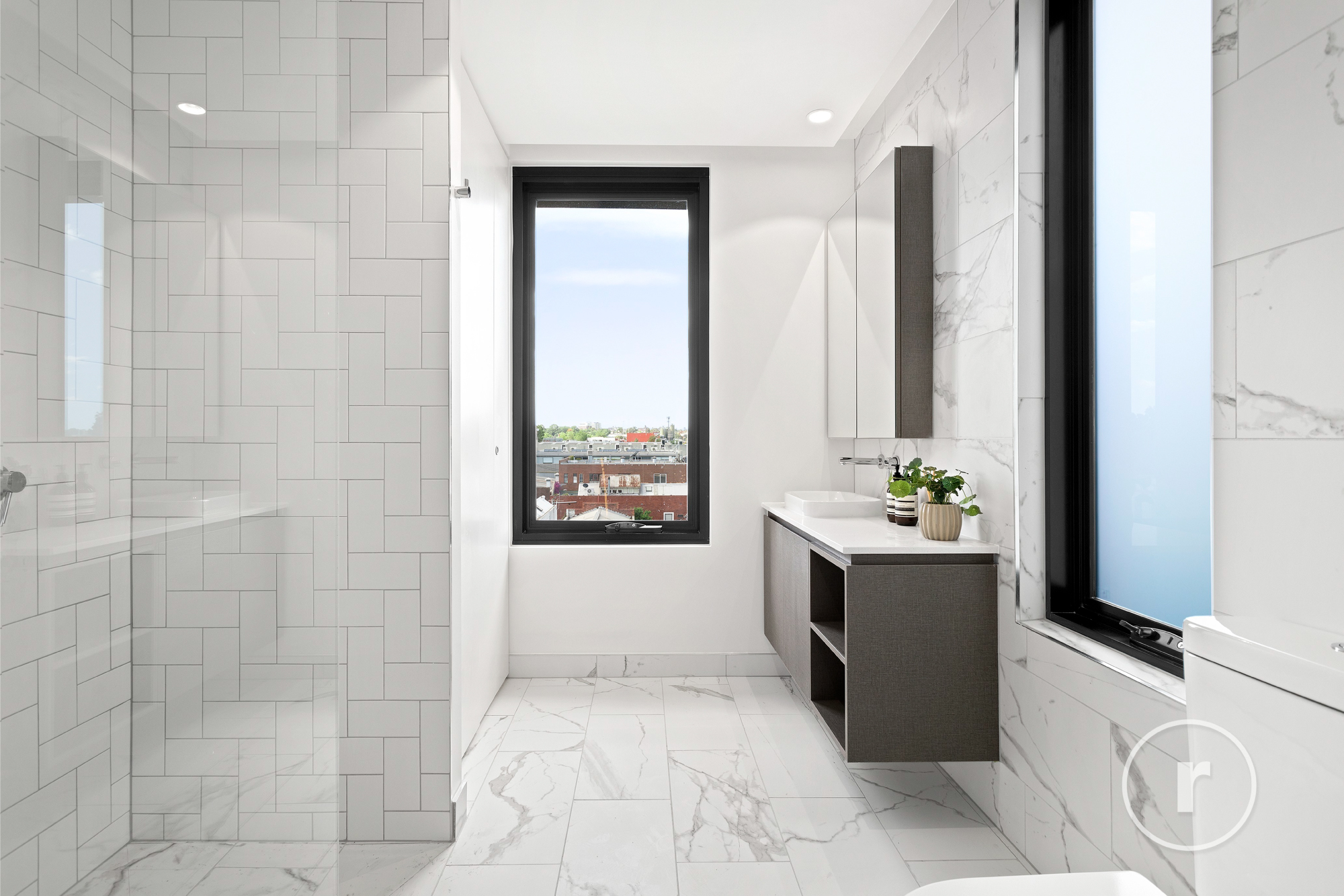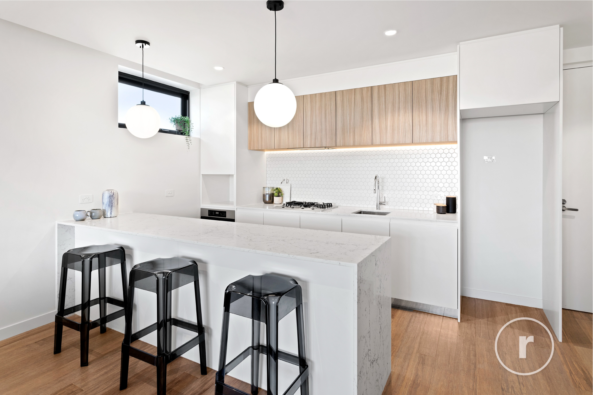 Finishes, fixTures & fittings embody a contemporary & sophisticated design palette that includes feature lighting & joinery, Miele appliances, stone-clad bench tops, s/s undermount sink & mosaic splashback to kitchen, floor to ceiling tiles & ceiling mounted showerheads to both light-filled bathrooms and so much more.